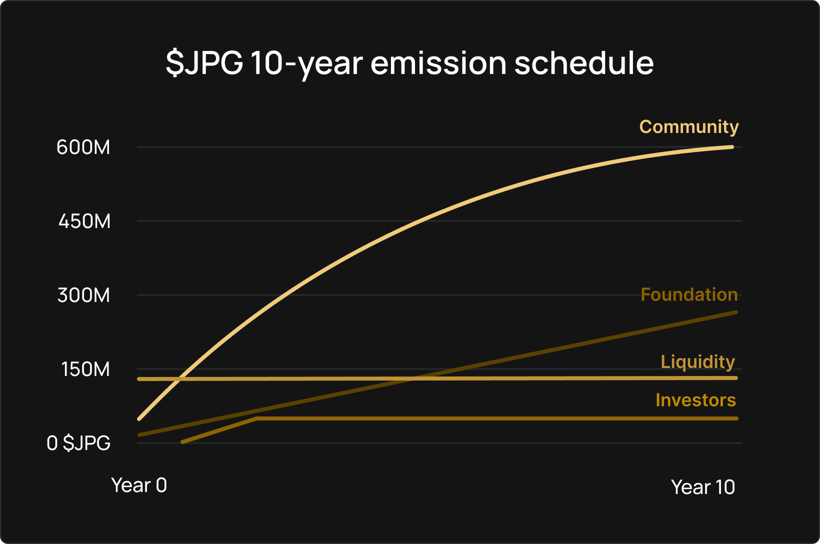 **Liquidity&#x20;**<mark style="color:yellow;">**14%**</mark>**&#x20;-** 100% unlocked from day 1 (140,000,000 $JPG). If more liquidity is required in the future, it will be provided from the foundation treasury.&#x20;
