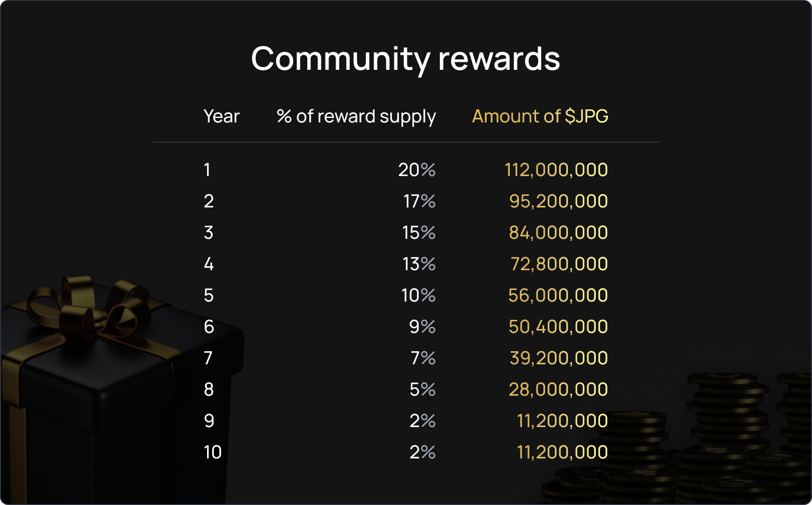 **Community Rewards&#x20;**<mark style="color:yellow;">**56%**</mark>**&#x20;-** The first distribution (50,000,000 $JPG) will be for Season 1 and all qualified past volume on jpg.store. The amount of $JPG you receive will be based on how much XP you've acquired from their rewards system. Visit jpg.foundation and sync your wallet to see your XP earned and how much $JPG you qualify for. 112,000,000 $JPG is set to unlock by the end year one, Sept 2024 (this 112m includes the 50m from season 1).  You can view the chart at the bottom of this page to see the unlock periods, but here is the annual amounts the community rewards that will be unlocked over the next 10 years.&#x20;